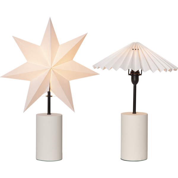 Stjärna på fot, vit pappersstjärna + veckad skärm. Vit fot tillverkad i trä och svarta detaljer som ger den lilla extra touchen. Stjärnan är den perfekta dekorationen till jul och advent. Placera den i ett fönster eller på en skänk. Sprider härlig julstämning, när julen är över byter du till skärmen och får en perfekt dekoration hela året. Denna produkt har FSC®-märkning.